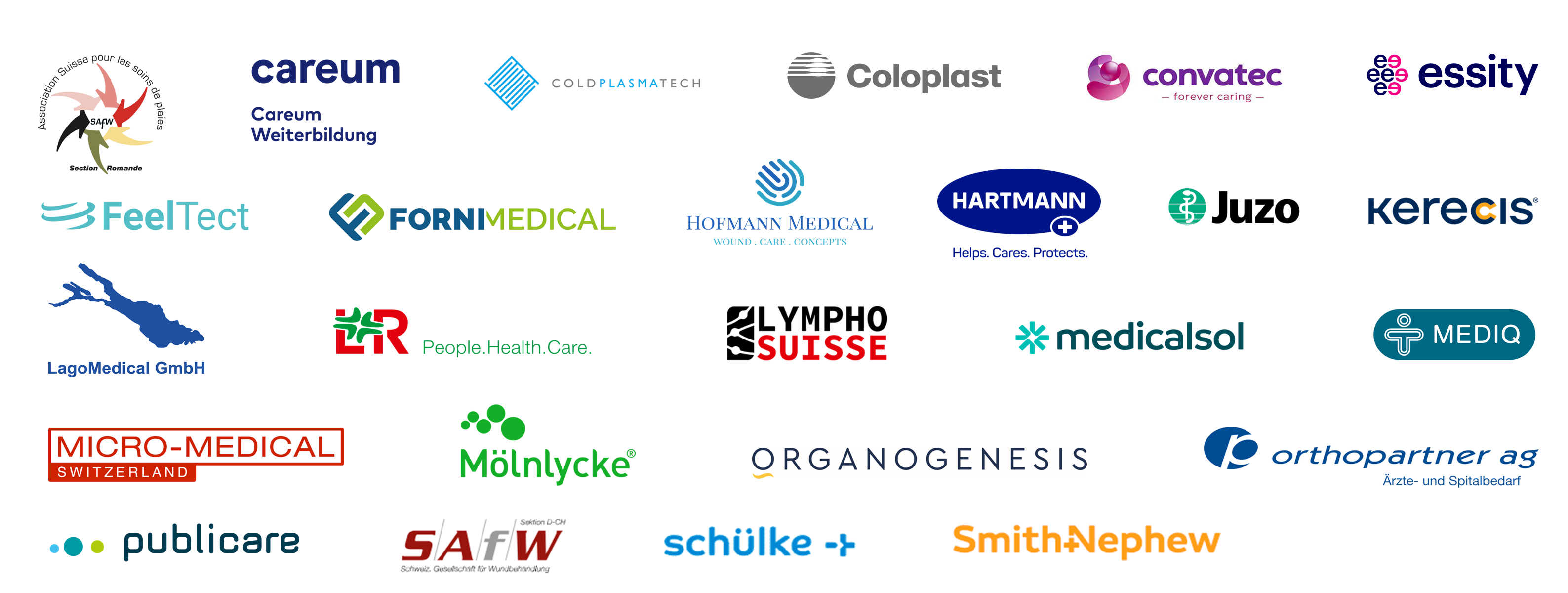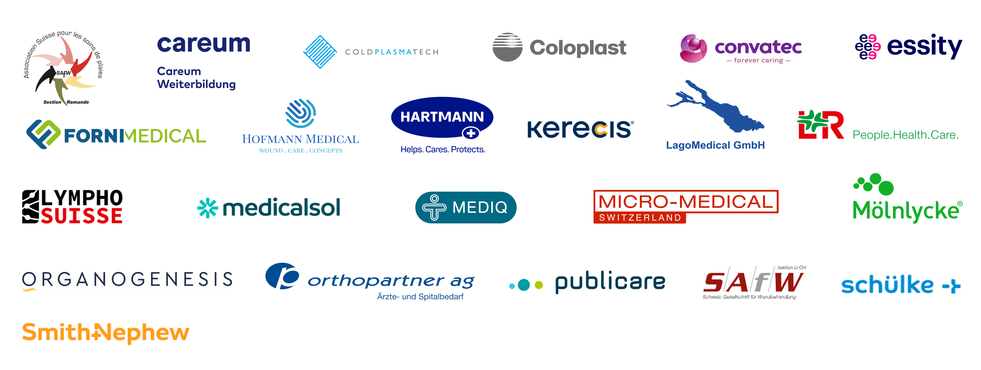 Association Suisse pour les soinsde plaies (SAfW Romande), Careum Weiterbildung, Coldplasmatech GmbH, Coloplast Schweiz, ConvaTec (Switzerland) GmbH, Essity GmbH, HOFMANN MEDICAL, IVF HARTMANN AG, Kerecis, Lagomedical GmbH, Lohmann & Rauscher AG, Lympho Suisse, medicalsol ag, Mediq Suisse AG, MICRO-MEDICAL AG, Mölnlycke Health Care AG, Organogenesis Switzerland GmbH, Orthopartner AG, Publicare, Schülke & Mayr AG, Schweizerische Gesellschaft für Wundbehandlung (SAfW D-CH), Smith & Nephew Schweiz AG