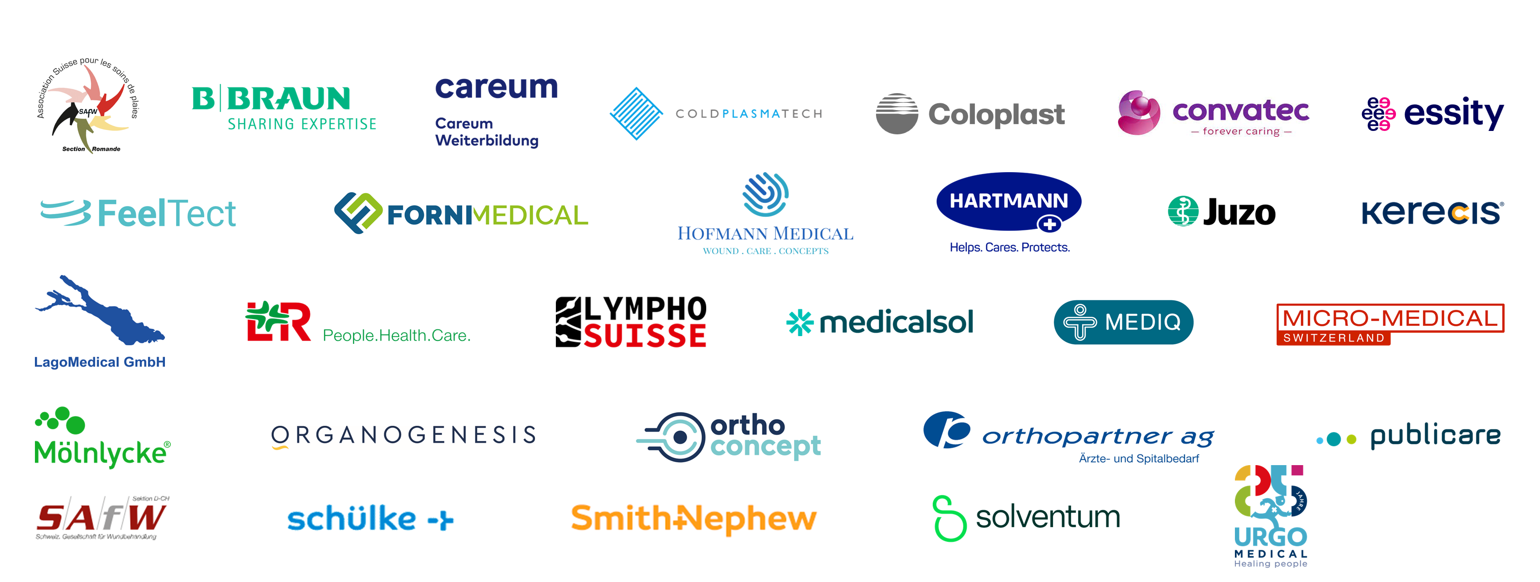 Association Suisse pour les soinsde plaies (SAfW Romande), B.Braun Medical, Careum Weiterbildung, Coldplasmatech GmbH, Coloplast Schweiz, ConvaTec (Switzerland) GmbH, Essity GmbH, FeelTect, FORNIMEDICAL, HOFMANN MEDICAL, IVF HARTMANN AG, Berro AG (Juzo), Kerecis, Lagomedical GmbH, Lohmann & Rauscher AG, Lympho Suisse, medicalsol ag, Mediq Suisse AG, MICRO-MEDICAL AG, Mölnlycke Health Care AG, Organogenesis Switzerland GmbH, orthoconcept, Orthopartner AG, Publicare, Schweizerische Gesellschaft für Wundbehandlung, (SAfW D-CH), Schülke & Mayr AG, Smith & Nephew Schweiz AG, Solventum, Urgo GmbH